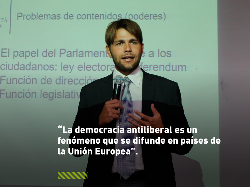 El académico, en su estadía en la Universidad, habló sobre las tendencias actuales de la democracia constitucional, un modelo que viene siendo amenazado en Europa por diferentes tendencias, como el surgimiento de democracias antiliberales, las cuales establecen regímenes semidemocráticos, especialmente en los países del Centro y Este del viejo continente, lo que configura una nueva forma de Estado cuyas particularidades son el autoritarismo, el decaimiento gradual de la democracia y el incremento de las crisis constitucionales.